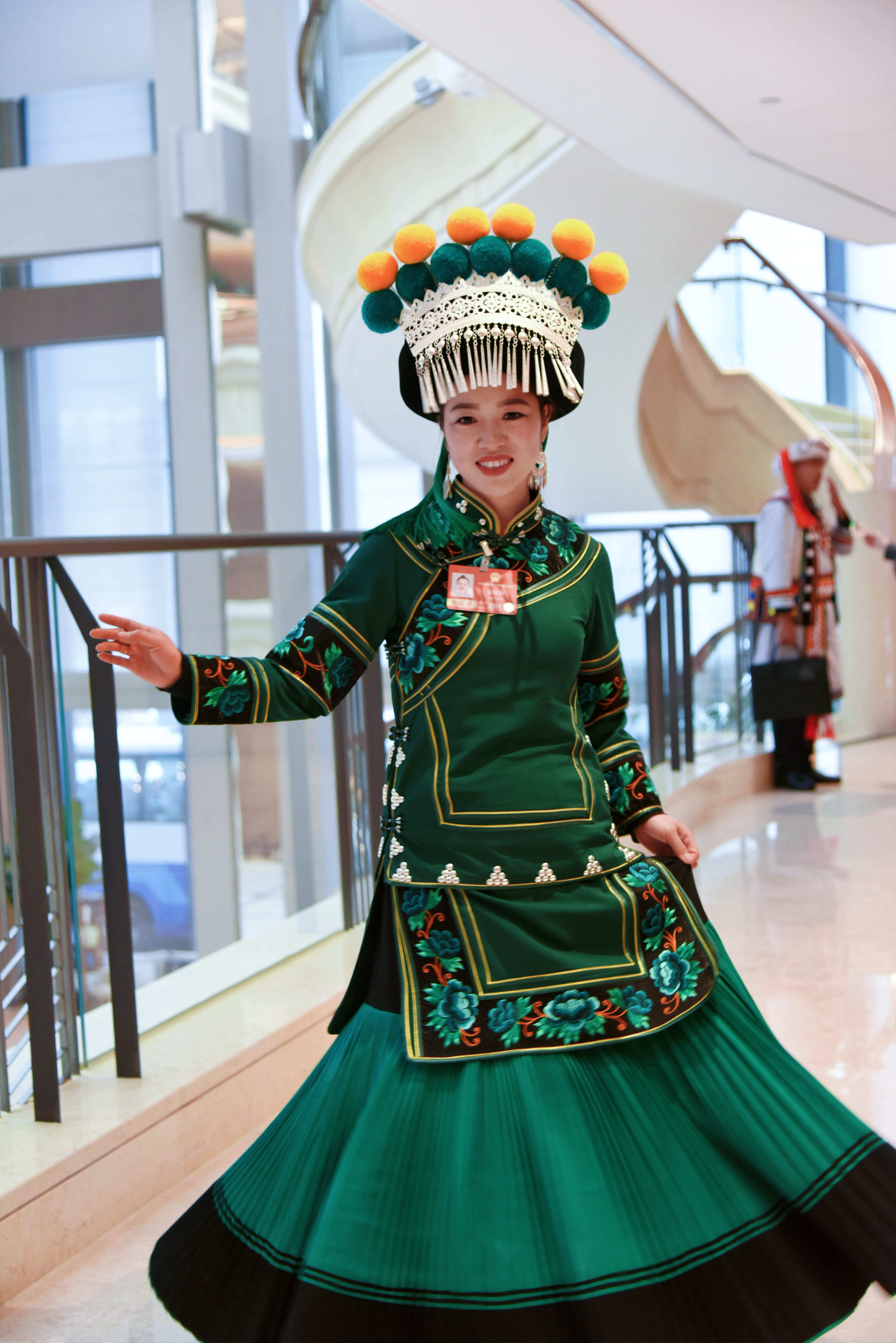 东谈主群中,宇宙东谈主大代表金瑞瑞的身摄影配瞩目。一袭深绿色彝族衣饰,是她的标记。细看,衣襟与袖口上,手工刺绣的渐变色山茶花大意盛放,百褶裙的每一谈褶裥王人压得笔挺。